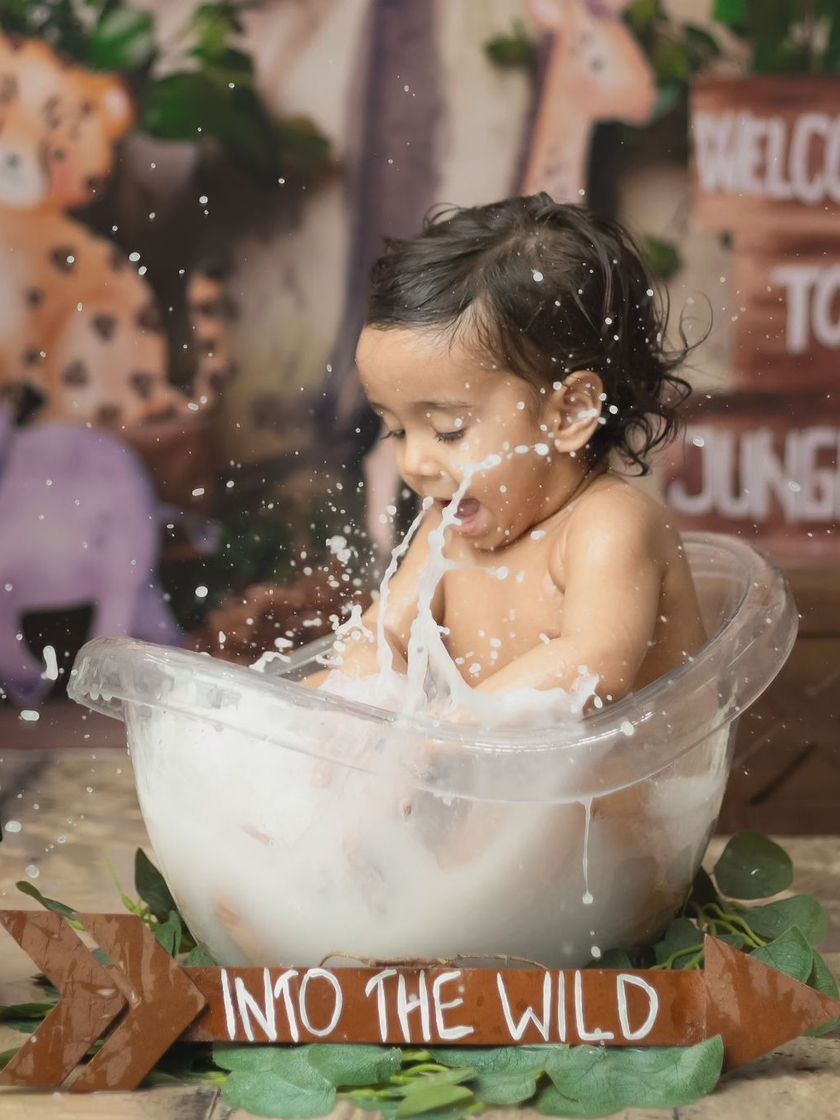 A fun and adorable add-on to our milestone or cakesmash sessions. Our milk bath setups are a great way to capture playful splashes and gummy smiles, with themes ranging from fruity oranges to wild jungles.