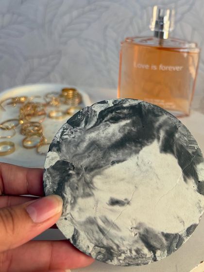 - Unique ceramic trinket trays and tea coasters, mostly oval and round, with an earthy, marbled finish.