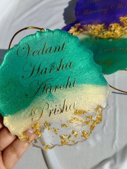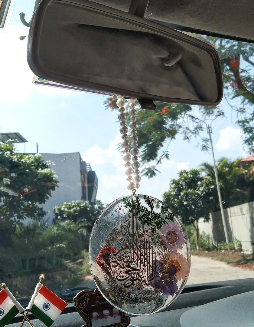 Personalize your car with a custom resin hanging ornament. I create these with family names, meaningful Islamic calligraphy like Ayat ul Kursi, or any design you have in mind, often incorporating real flowers and metallic flakes.