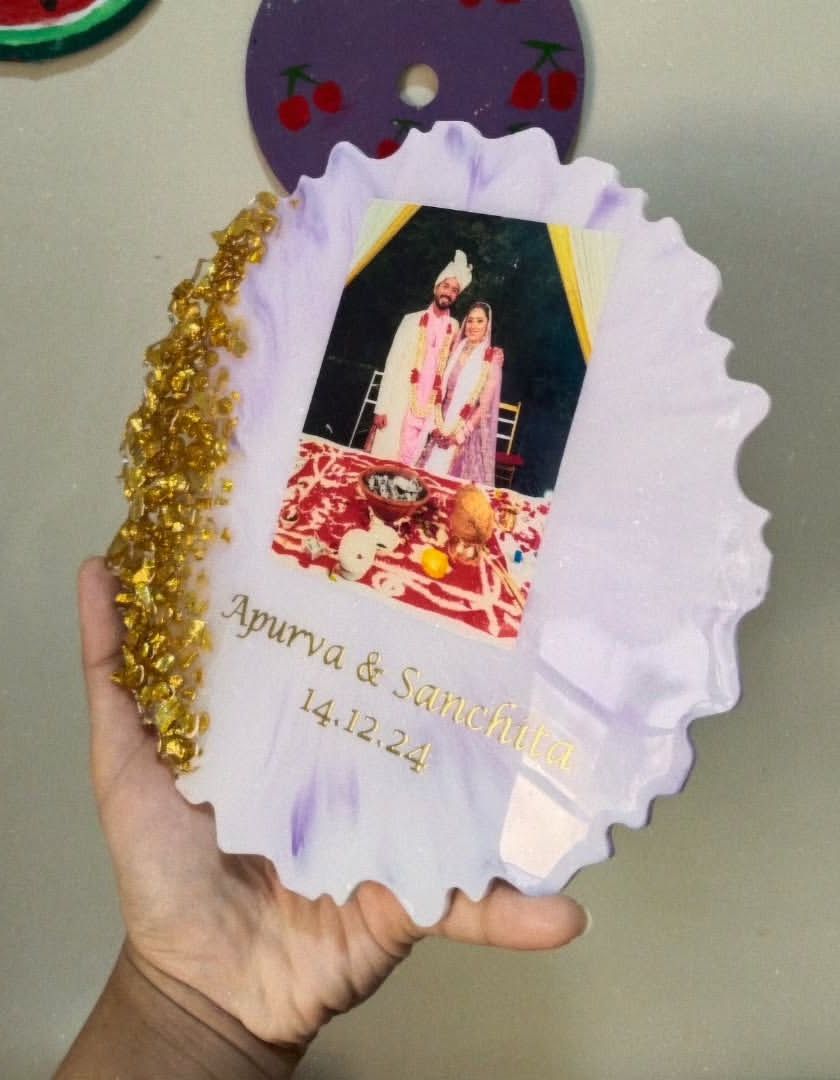 I capture your special moments and names in custom resin frames. We can include photos, names, dates, and decorate with gold flakes, pearls, or colors of your choice to create a perfect gift for anniversaries, birthdays, or just because.