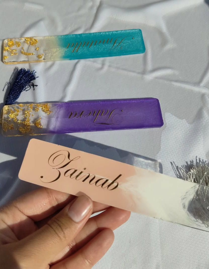 I create small, everyday items with a personal touch. This includes custom name bookmarks, initial keychains, car hangings, and fridge magnets, all made with your choice of colors and decorations.