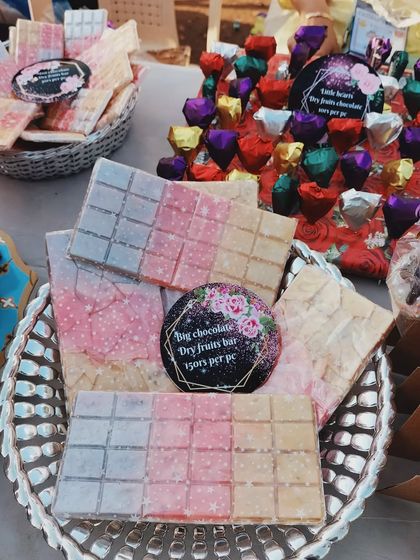 I make fresh, vegetarian chocolate hampers and bouquets at home, customize them with your choice of shapes, flavors, and messages, and set them up for your events.