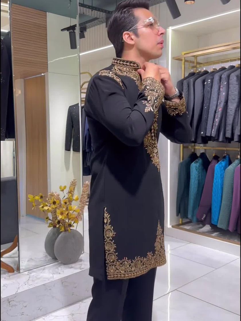 For the main ceremony or festive occasions, I design sherwanis and kurtas with detailed, handcrafted embroidery. We use gold and silver thread work, mirrors, and unique patterns to create pieces that are both traditional and unforgettable.