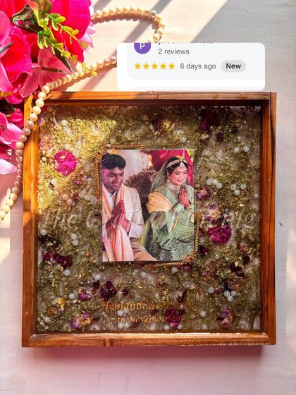 Your wedding varmala is a symbol of your union, too precious to fade away. I preserve your wedding or engagement garlands in custom-designed resin frames and decorative plates, turning them into timeless art for your home. Each piece is handcrafted with your photos, names, and special dates to tell your unique love story.