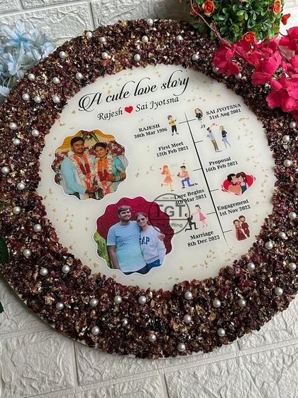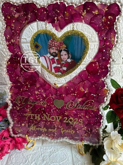 Hello ji! Hum The Gifting Tree hain, aur hamara kaam hai aapki shaadi ki yaadon ko resin art mein badalna. Ek din socha, varmala sookh kar gayab ho jaati hai, toh kyun na use hamesha ke liye sambhal lein? Ab tak 15,000 families ki love story ko ek frame ya clock mein badal chuke hain. Har piece mein ek kahani hoti hai, aur hum poori koshish karte hain ki uss yaad ko masterpiece bana dein.