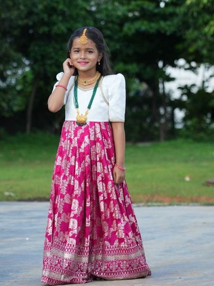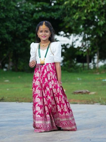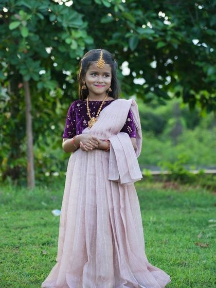 Our kids' collection features traditional South Indian styles like langa davanis, complemented by modern design elements and embellishments. Each piece is crafted to ensure the perfect blend of traditional aesthetics and child-friendly comfort.