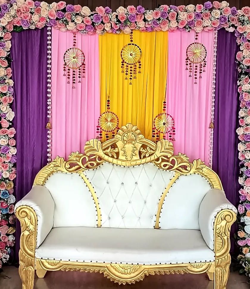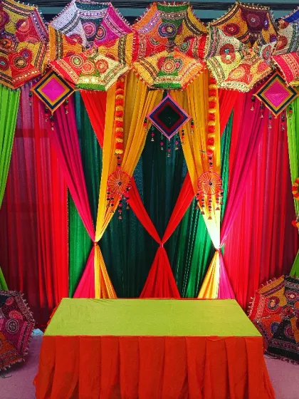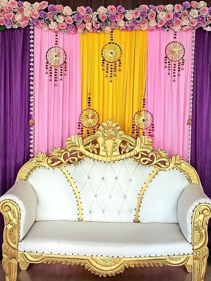 For a classic godh bharai, I use vibrant drapes, decorative Rajasthani umbrellas, and floral arrangements to create a festive and colorful atmosphere. These setups are perfect for traditional ceremonies and bring a beautiful Indian touch to your celebration.