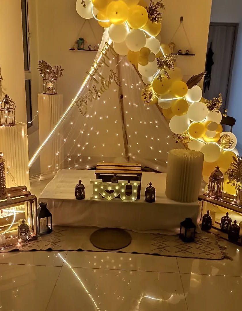 Perfect for intimate celebrations, I can set up a beautiful and cozy tent decorated with fairy lights, balloons, and lanterns right in your home. It's a wonderful idea for a small baby shower, birthday, or just a special family moment.