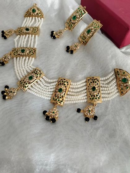 This collection features my curated range of gold-plated Jadau necklaces, from traditional chokers perfect for layering to elegant long pendant sets. I focus on pieces that offer versatility, with options in various colours like emerald green and ruby red, suitable for both bridal and festive wear.
