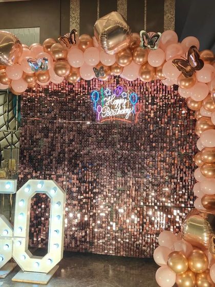 Creative Props & Setups - Balloon arch party, neon sign decoration, sequin wall, real flowers - sab milta hai.