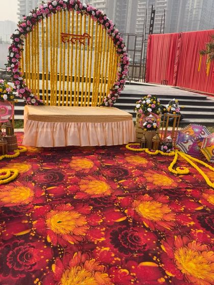 We create bright and cheerful decorations for Haldi ceremonies, a key part of pre-wedding festivities. Our signature style includes vibrant backdrops made with yellow marigold flowers, colorful drapes, and traditional props like Rajasthani umbrellas to make your event picture-perfect.