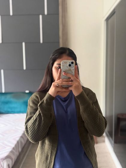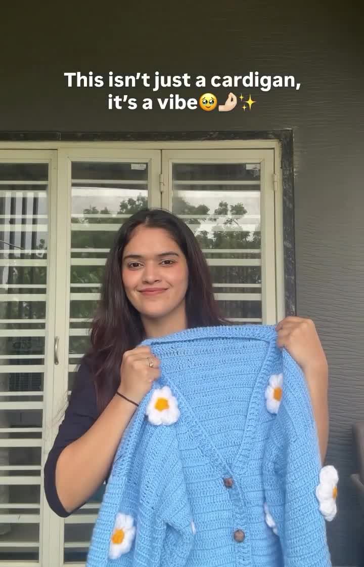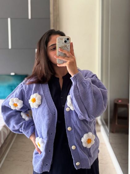 This is our cheerful, V-neck, button-down cardigan decorated with big handmade daisy flowers. It's a free size that comfortably fits sizes M to XXL, and we make it using premium quality wool for a soft feel.
