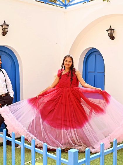 We offer a curated collection of elegant gowns and dresses specifically designed for pre-wedding photoshoots. Our selection includes ball gowns, flying gowns, and bodycon dresses in various styles and colors like maroon, pink, and blue butterfly designs.
