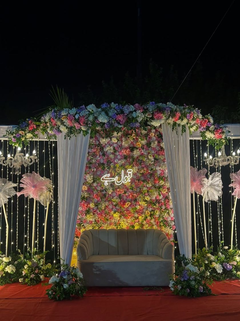 I design sophisticated backdrops for your Nikah or Engagement ceremony. My designs feature lush floral arrangements, elegant drapery, sparkling chandeliers, and custom neon signs like 'Qubool Hai' to create a romantic and memorable setting for your special vows.