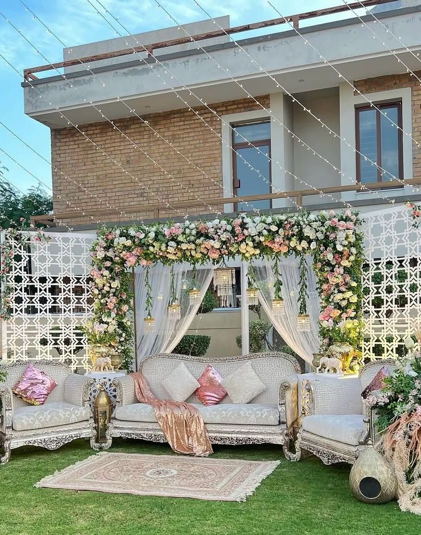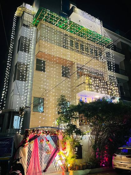 I make sure your home looks like a 'shadi wala ghar' with stunning facade decorations. From elegant drapes and floral entrance gates to covering the entire building in a magical web of fairy lights, I create a grand and festive announcement for your celebrations.