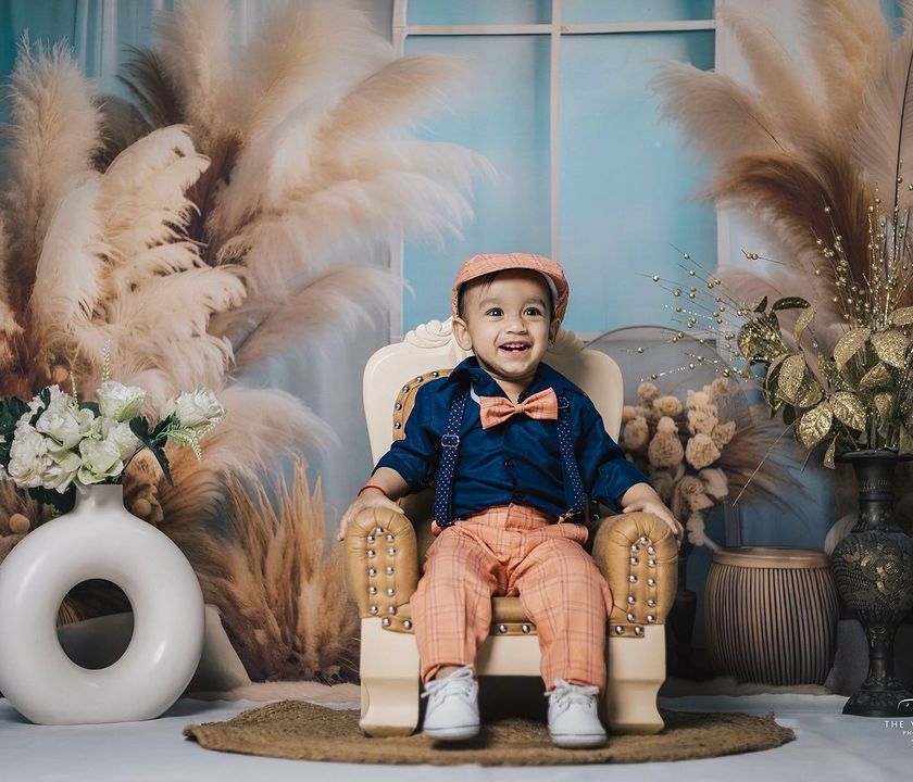 In our Dwarka studio, we have full control over lighting and backdrops to create stunning portraits. We offer everything from clean, minimalist setups on a white background to elaborate themed sessions with props like our boho pampas grass arrangements and miniature armchairs.