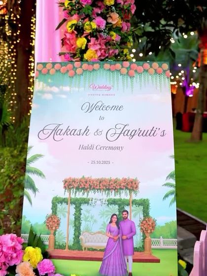I design signage that captures the joyful and vibrant energy of your Haldi. This includes welcome boards with traditional yellows or unique color themes like elegant blues, often featuring personalized caricatures to add a fun, memorable touch.