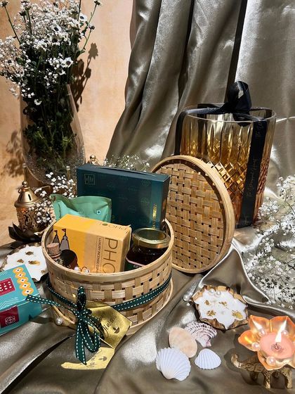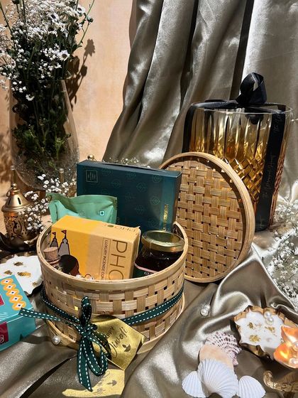 We specialize in creating personalized luxury gift hampers for all occasions including Diwali, Christmas, weddings, anniversaries, baby showers, and corporate events. Each hamper features premium packaging with high-quality fabrics, prints, and decorative elements like ribbons, dried flowers, and greenery.