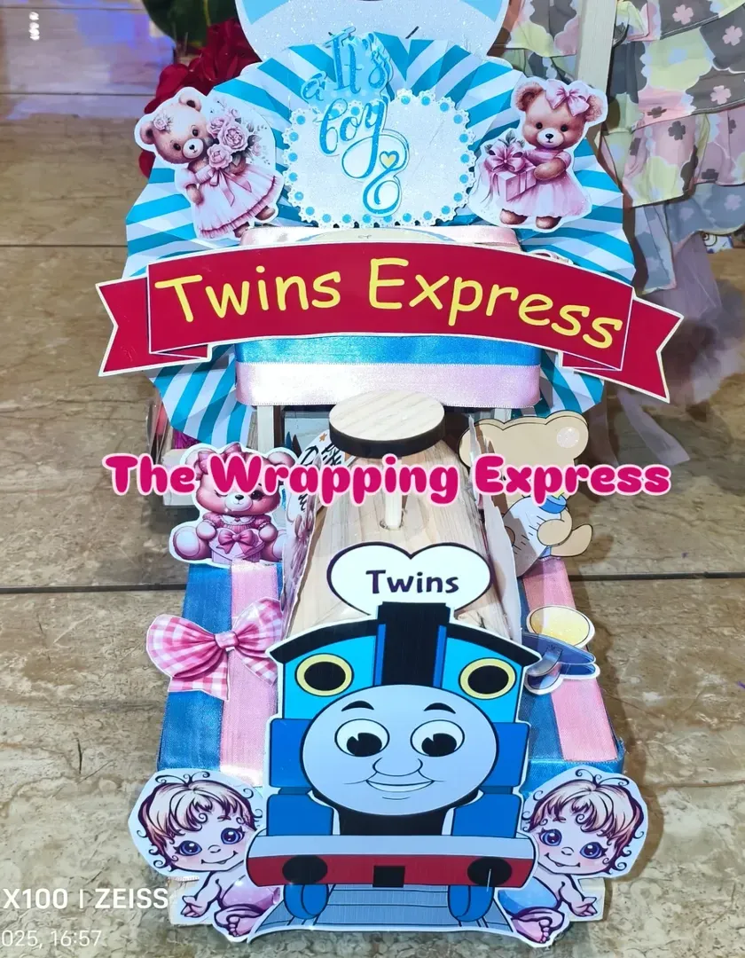 Welcoming twins is extra special, and I design unique 'Twins Express' train hampers for them. I can create themes for a boy and a girl, two boys, or two girls, with personalized sections for each baby's wardrobe, toys, and accessories.