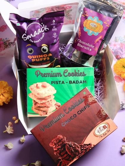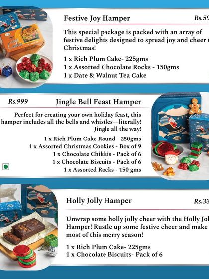 We put together fresh-baked gift hampers for festivals and corporate events, with custom options and a mix of cakes, cookies, chocolates, and savory snacks.