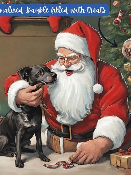 - 1x Treat-Filled Bauble: Clear plastic ornament filled with small treats, personalized with the pet's name.