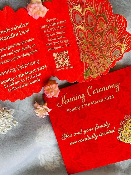 We offer a huge collection of premium and designer wedding cards for every budget. Visit our Koramangala store for a smooth and helpful invitation design process.