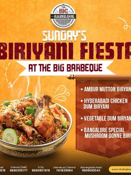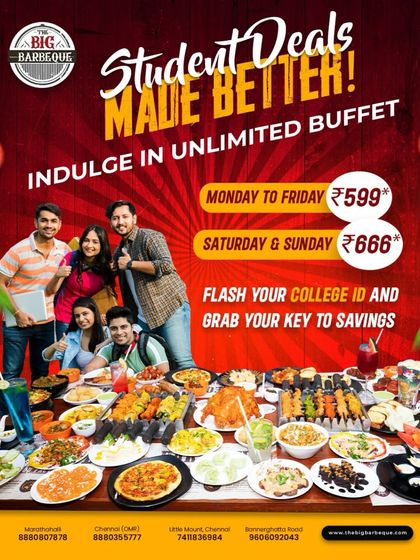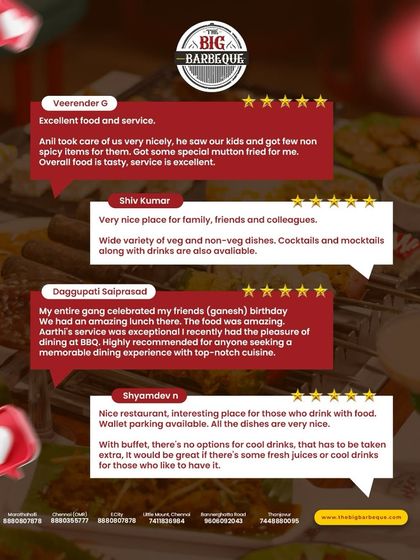 We started The Big Barbeque because, really, why pick just one thing when you can have it all? Our place is where birthdays, random Tuesdays, and big wins get celebrated with endless food, laughter, and that grill sizzle. Bangalore, Chennai - we’re part of the local buzz. Festivals, cricket wins, family get-togethers, we’re all in! Our promise? You’ll leave stuffed, smiling, and maybe already planning your next visit.