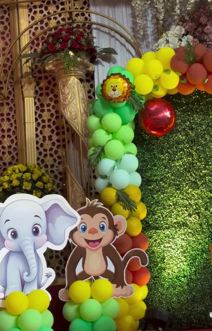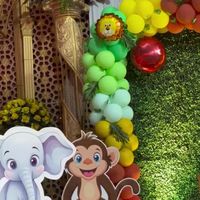 I bring the jungle to you with vibrant safari and animal-themed decorations. These setups often feature grass backdrops, cute animal cutouts like monkeys and tigers, and balloon garlands in earthy tones, perfect for a "Wild One" first birthday.