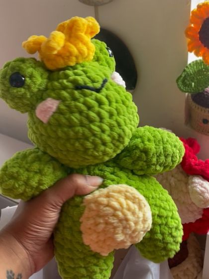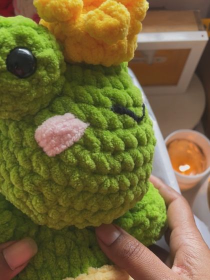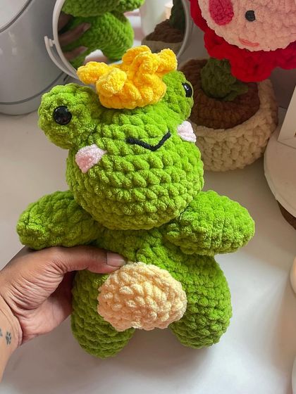 We create whimsical handmade plush toys using soft, plush yarn with designs like the "Frog Prince" and pandas. Each toy is carefully crafted with attention to detail and texture, making them perfect as comforting companions.