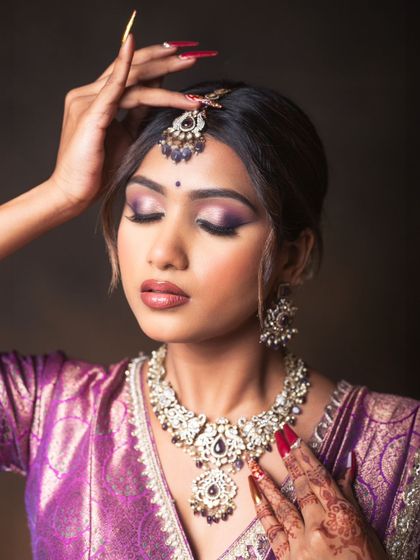We create custom bridal makeup and hair looks for every wedding event, using pro products and covering everything from saree draping to family styling.