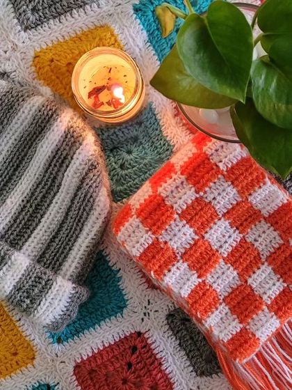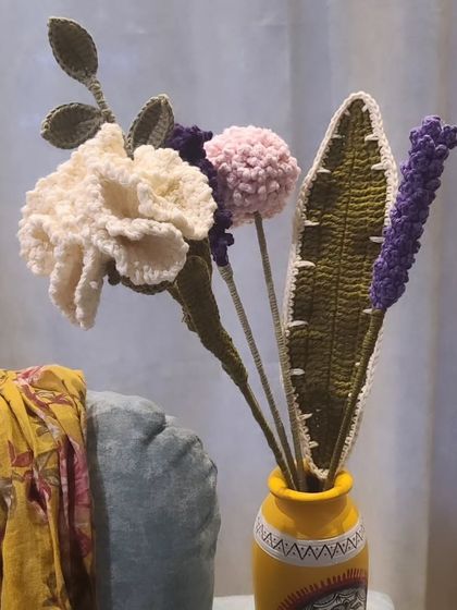 We make handmade crochet decor like flower bouquets, pillows, blankets, scrunchies, and keychains, and also take custom orders for unique designs.