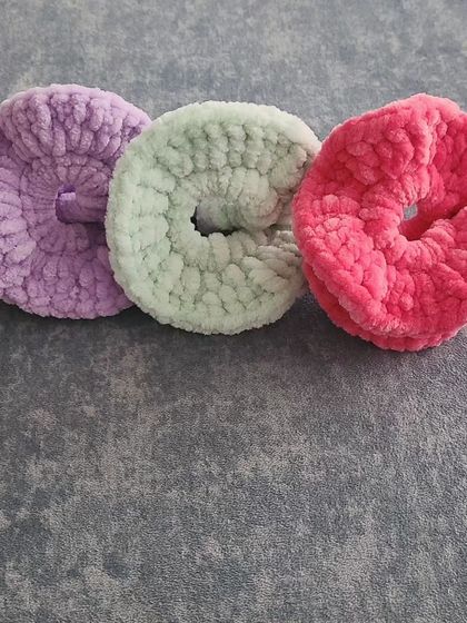 We create handmade crochet accessories including fluffy scrunchies in pastel colors and small plushie keyrings. Each piece is crafted with soft, textured yarn for enhanced tactile appeal.