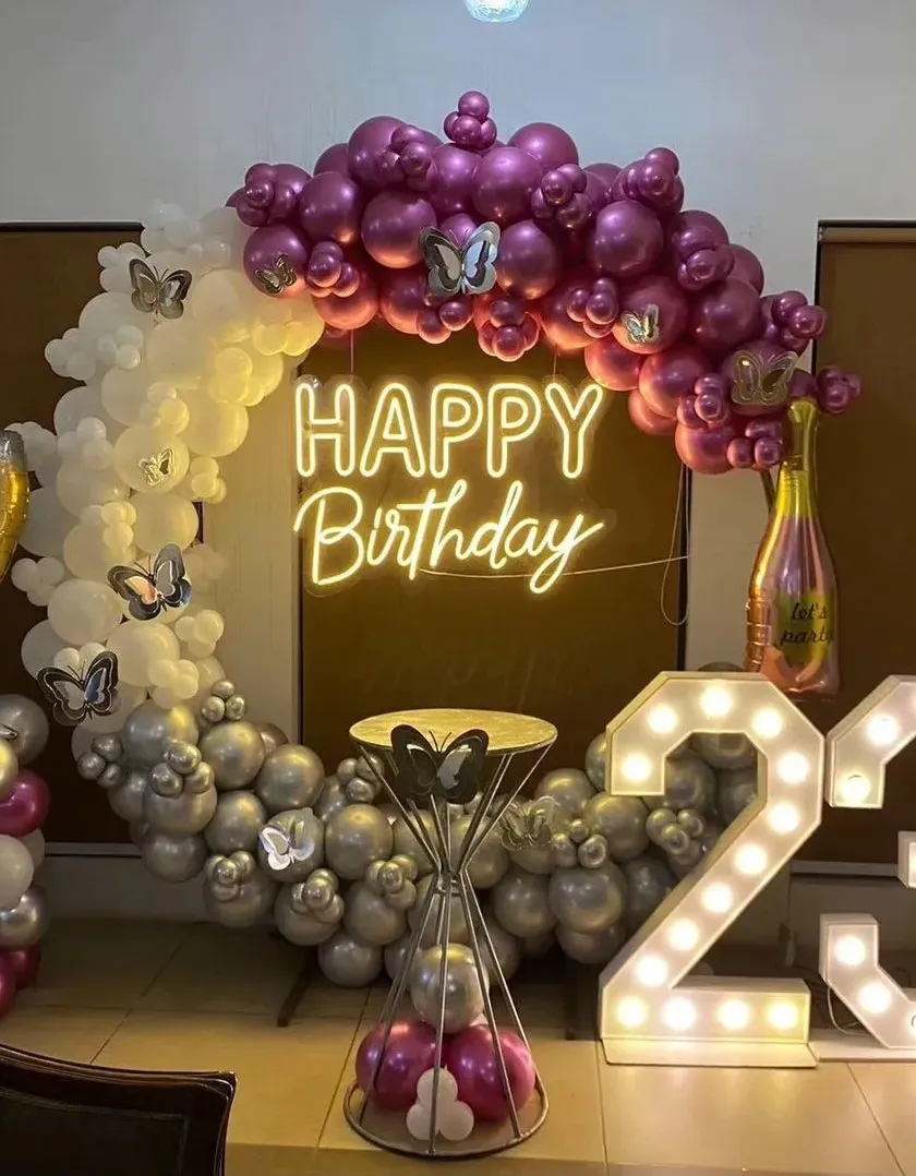 I design decorations for birthdays of all ages, from a child's first birthday to a 50th milestone celebration. My setups range from bold and modern themes with neon lights and marquee numbers to elegant and personalized arrangements with custom backdrops and props.