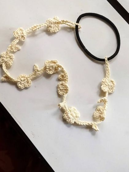 We create handmade crochet accessories including earrings with floral and hoop designs, decorative bag charms, necklaces with circular patterns, and hair accessories with minimalist floral motifs. Each piece is crafted with intricate detail using eco-friendly materials.
