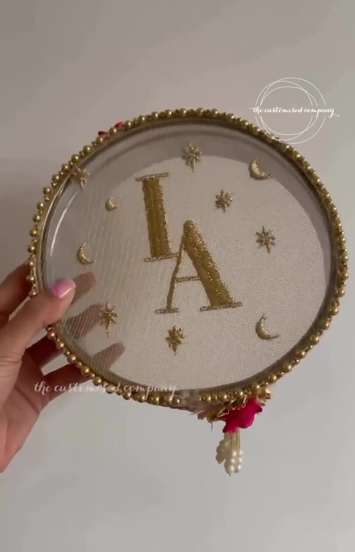 I design elegant, personalized items to make your Karva Chauth rituals even more meaningful. My specialty is the custom-embroidered channi, or sieve, which can be monogrammed with initials, creating a beautiful heirloom to commemorate this special day of love and devotion.