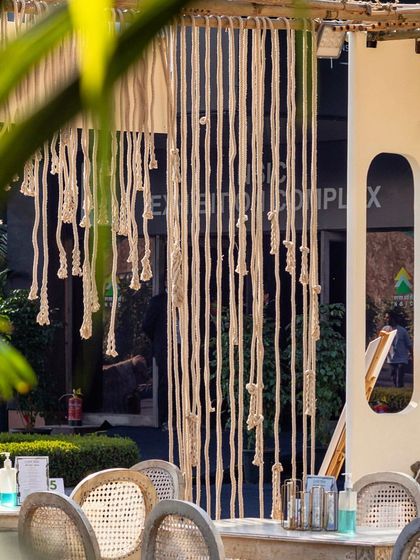 - Ceiling Treatment: Custom ceiling elements such as wooden pergolas, bamboo grid work, or suspended rope installations to create an enclosed room feel.