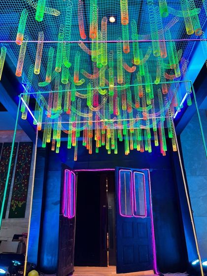 - Ceiling Art: Large-scale suspension installation over the central area. Options include neon-colored slinky springs, hanging geometric shapes, or chandelier clusters. Includes trussing and rigging safety checks.