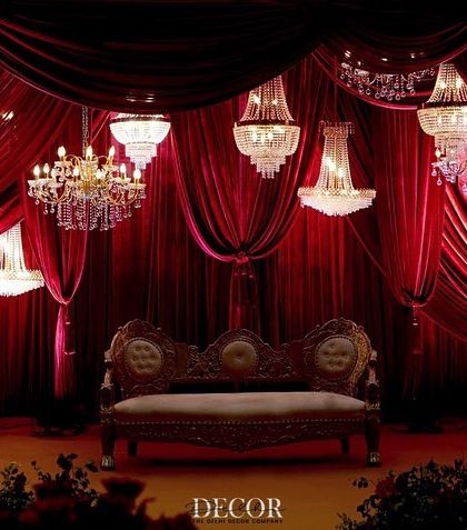 - Velvet Draping: Floor-to-ceiling heavy Red Velvet (or deep maroon) draping covering the venue perimeter and masking standard walls (approx. 100-150 running feet).