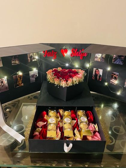 This is our signature surprise, designed for the ultimate wow factor. Lift the lid and watch it unfold to reveal a cascade of personal photos, fairy lights, and a beautiful heart-shaped box of roses, with a secret drawer for chocolates or other treasures.