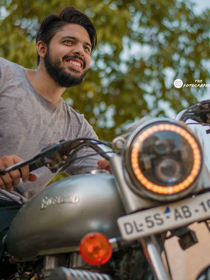 Beyond candid street shots, I also offer posed lifestyle portrait sessions for individuals. This shoot features a rider with his custom Royal Enfield, showcasing a more commercial and directed style of photography.