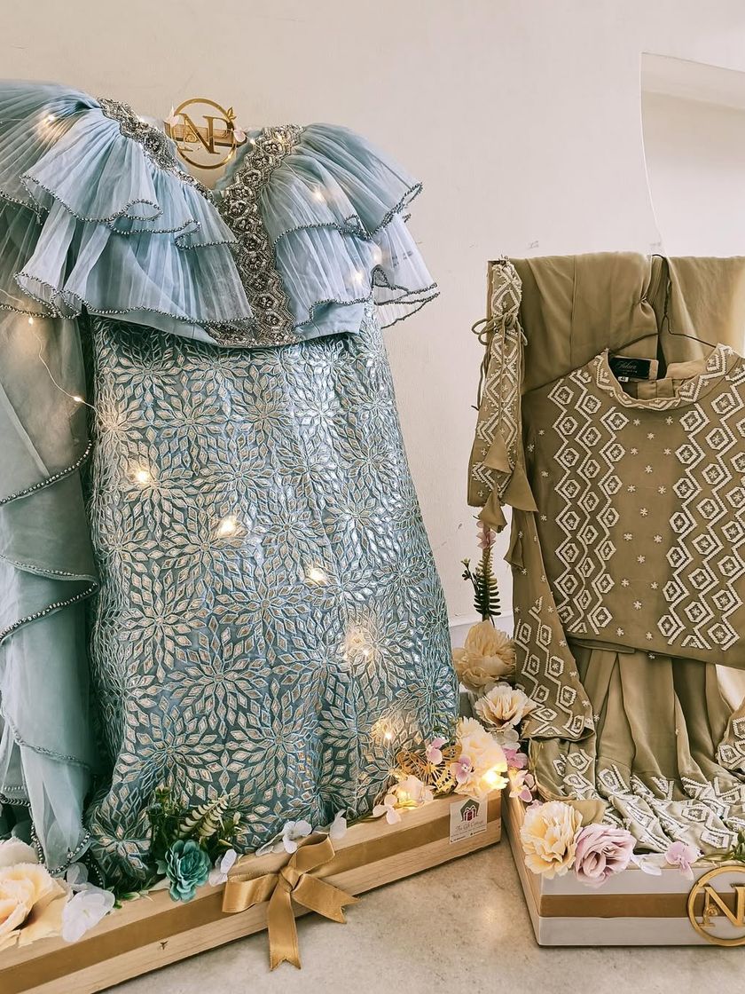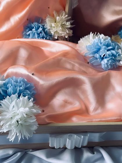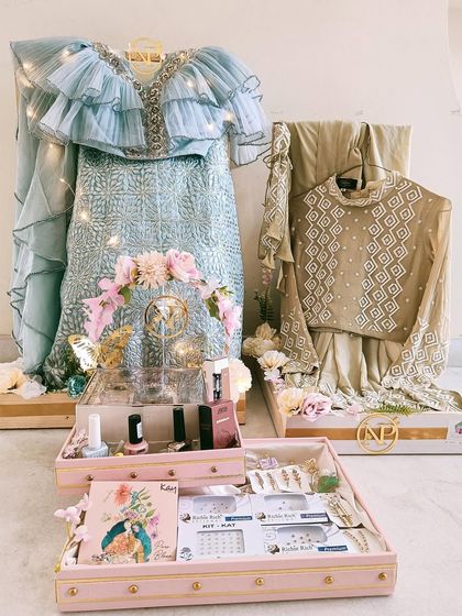 We specialize in bespoke trousseau packing that turns your precious wedding gifts and outfits into works of art. We use premium materials like pinewood trays and acrylic boxes, embellished with fresh or faux florals, custom monograms, and thematic decor to match your wedding style.