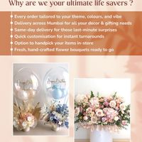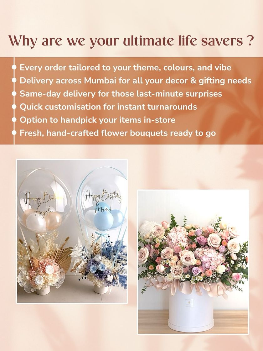 We make gifting easy and fun. Whether you order online via Instagram or WhatsApp or walk into our Santacruz store, we are ready to help you. We are known for our same day delivery across Mumbai and quick in store customizations.
