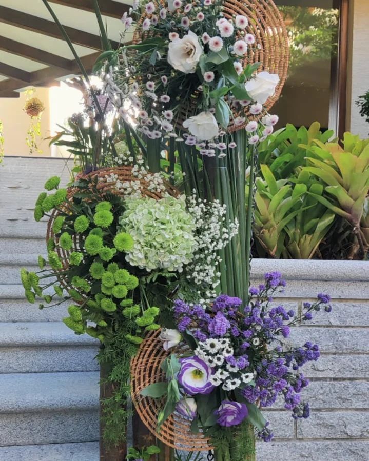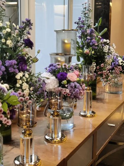 Our stylebook includes chic and modern designs that blend different textures and elements. We often combine natural elements like pampas grass with sleek glass and candlelight for a sophisticated look, or create unique floral installations for corporate spaces and events.