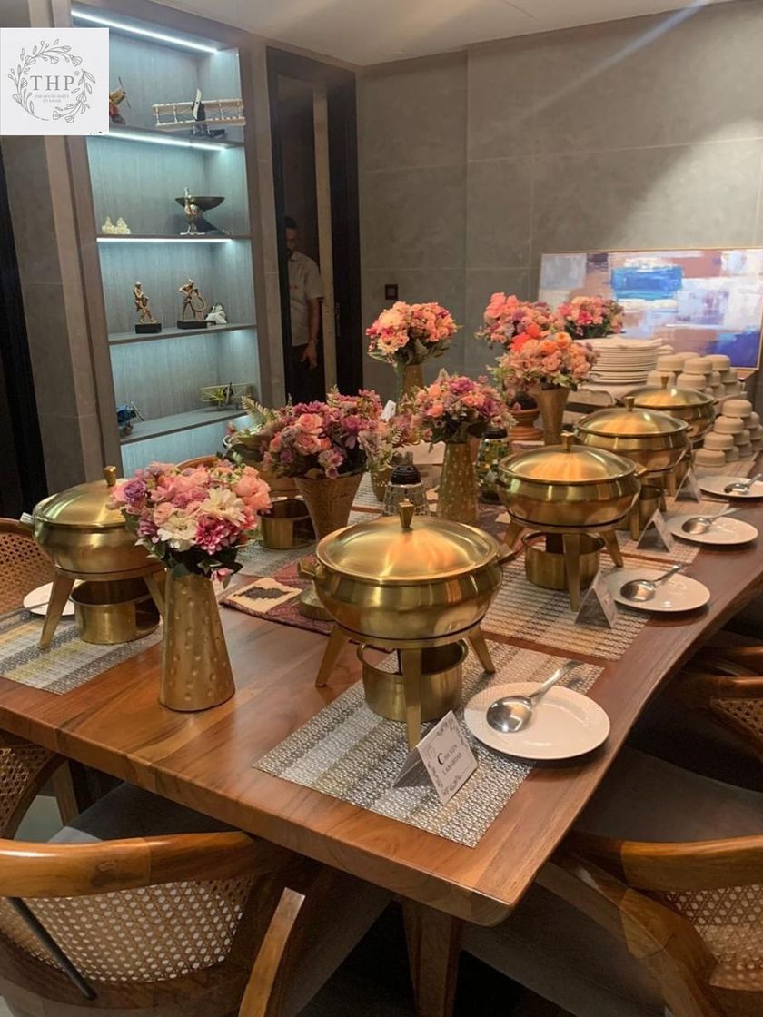 We believe presentation is key. Our service includes elegant buffet setups using premium brass and black pottery serving dishes, beautiful floral arrangements, and proper table linens to create a sophisticated look.