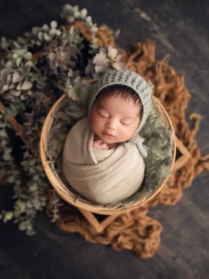I love mixing posed shots with candid lifestyle photos. My setups lean toward soft whites, gentle pastels, and earthy tones. Got a wild idea? I do creative baby photo themes from teddy bear cuddles to fantasy worlds, and I use digital magic for those impossible setups (baby as an ice cream scoop, anyone?).