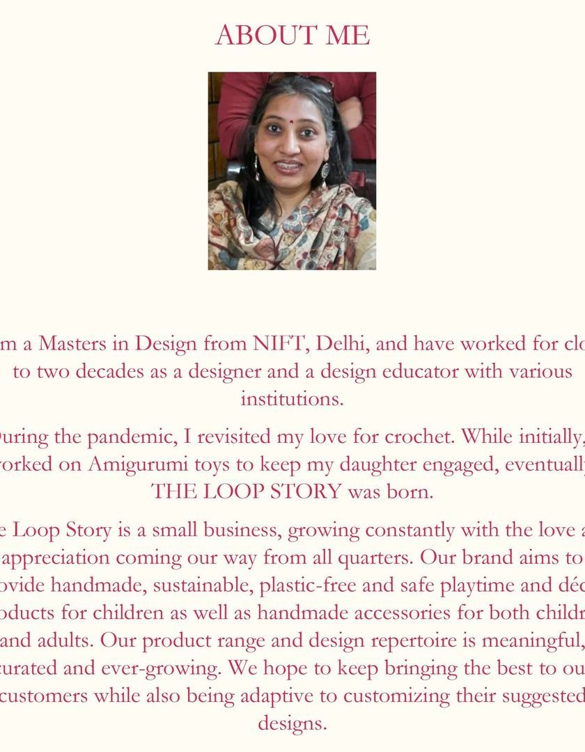 I'm Payal, a NIFT alumna who rediscovered my passion for crochet during the pandemic. The Loop Story is my way of sharing the joy of creating something beautiful and sustainable with your own hands, from toys and decor to accessories.
