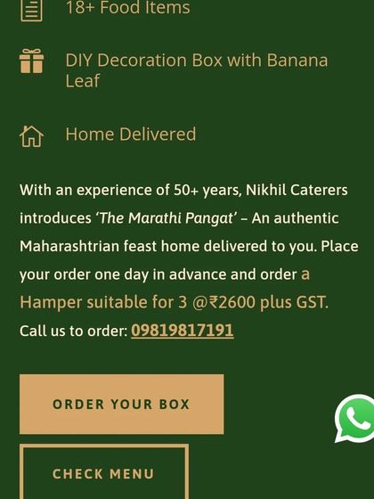 What We Offer - Traditional Marathi meal hampers, full-service catering for weddings and poojas, festival hampers like Diwali Faral delivery.