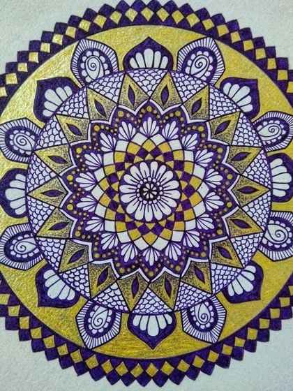 I create intricate mandala designs using fine liner pens, watercolor, and metallic markers. Each piece is crafted as a meditative process, focusing on detailed patterns and symmetrical designs.