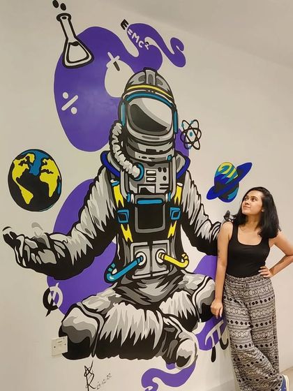 - I don’t stick to a single look. Sometimes it’s a hand-painted feature wall with cosmic astronauts, sometimes it’s traditional Indian mural art inspired by Pichwai or Madhubani.