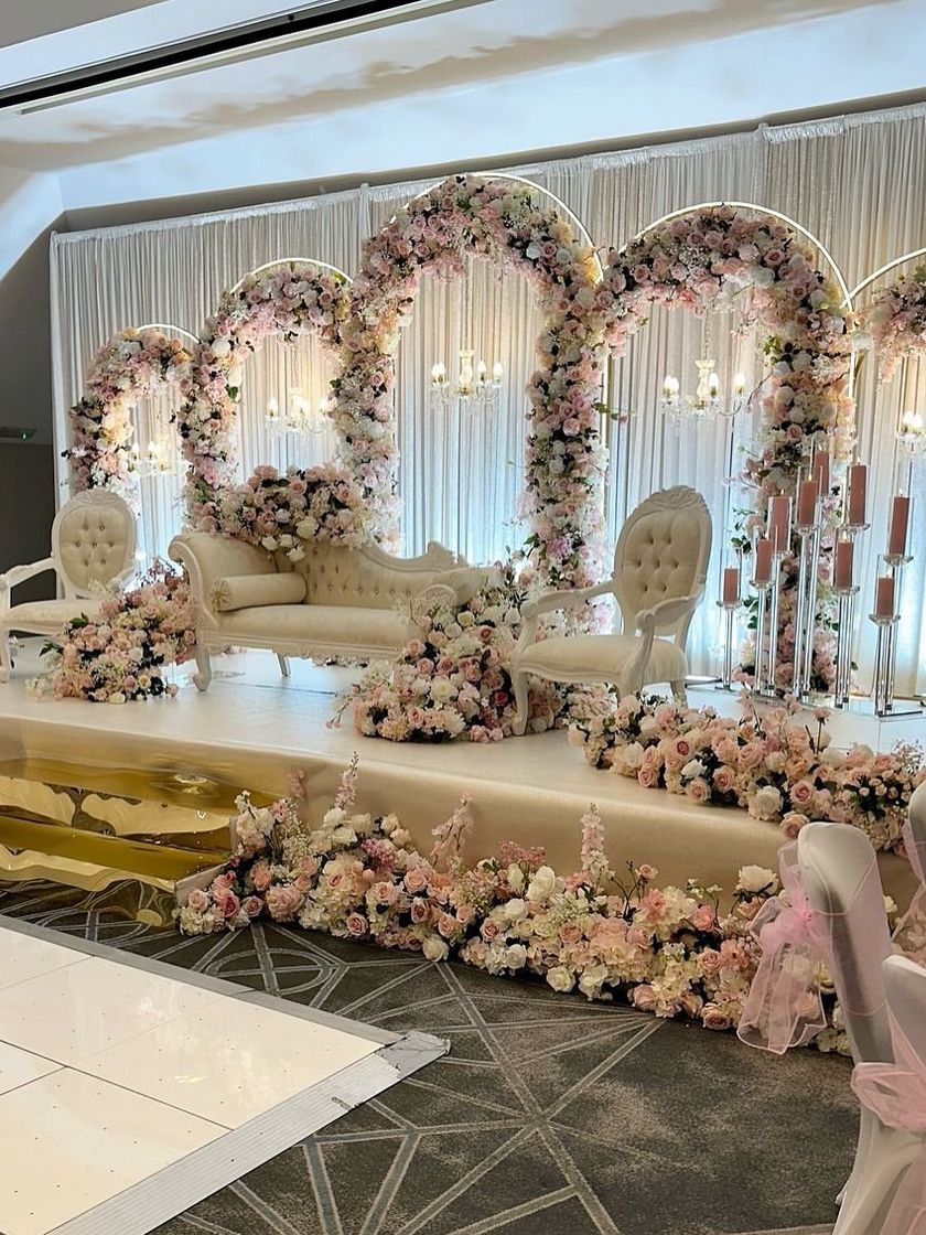 I design stunning focal points for your most important moments, including engagements, Roka ceremonies, and receptions. These setups range from classic floral arches and opulent drapery to modern, minimalist designs with custom lighting, ensuring the stage perfectly reflects your style.